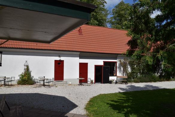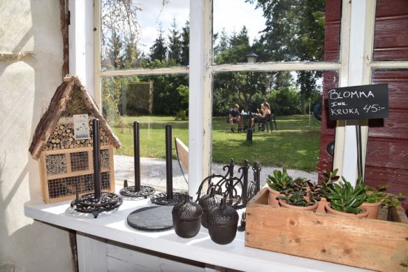 Genom fönstret syns en grupp som fikar i mysiga trädgården. Vid nästa besök vill jag äta frukost där efter en skön hotellnatt i lantlig miljö.