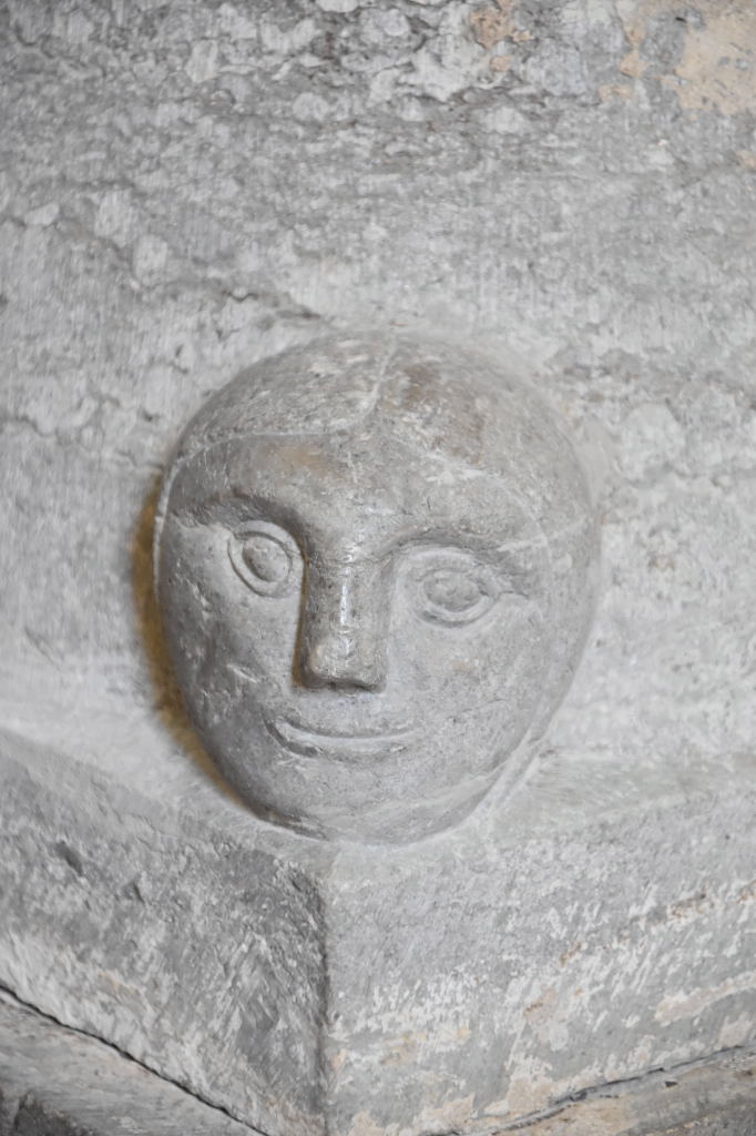 Ett av fyra naivt huggna manshuvud på dopfuntens fot.