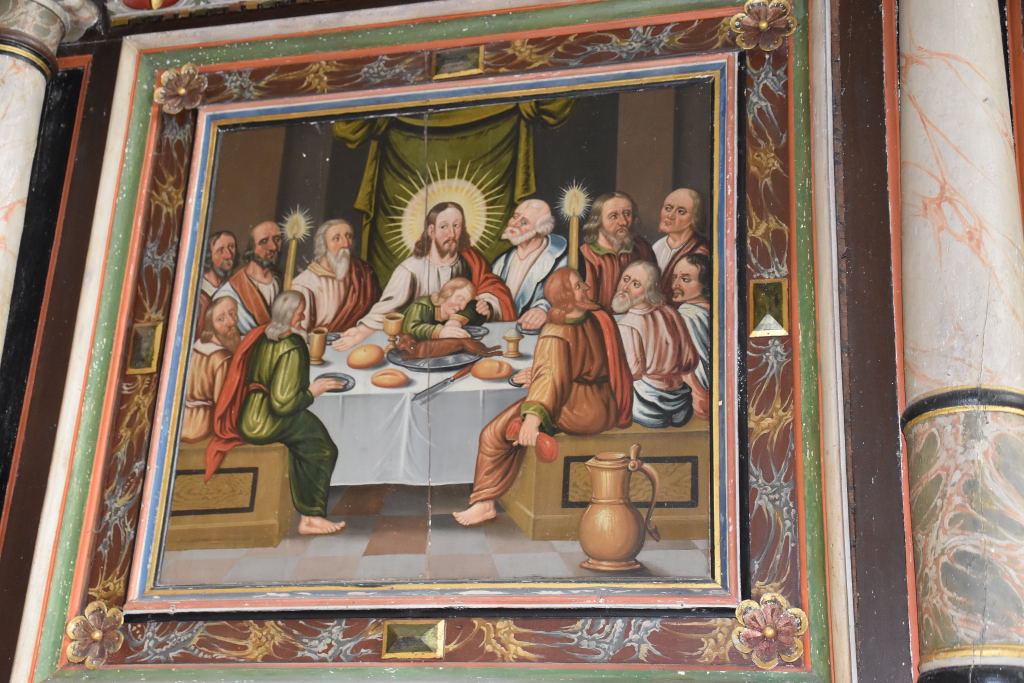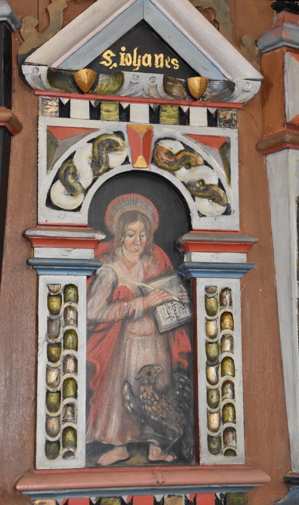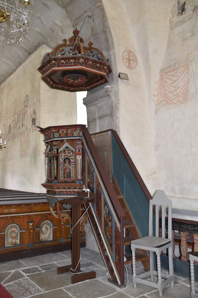 Predikstolen med sitt tak och detaljbild på Johannes är också från socknens glansdagar (Liksom bänkinredningen).