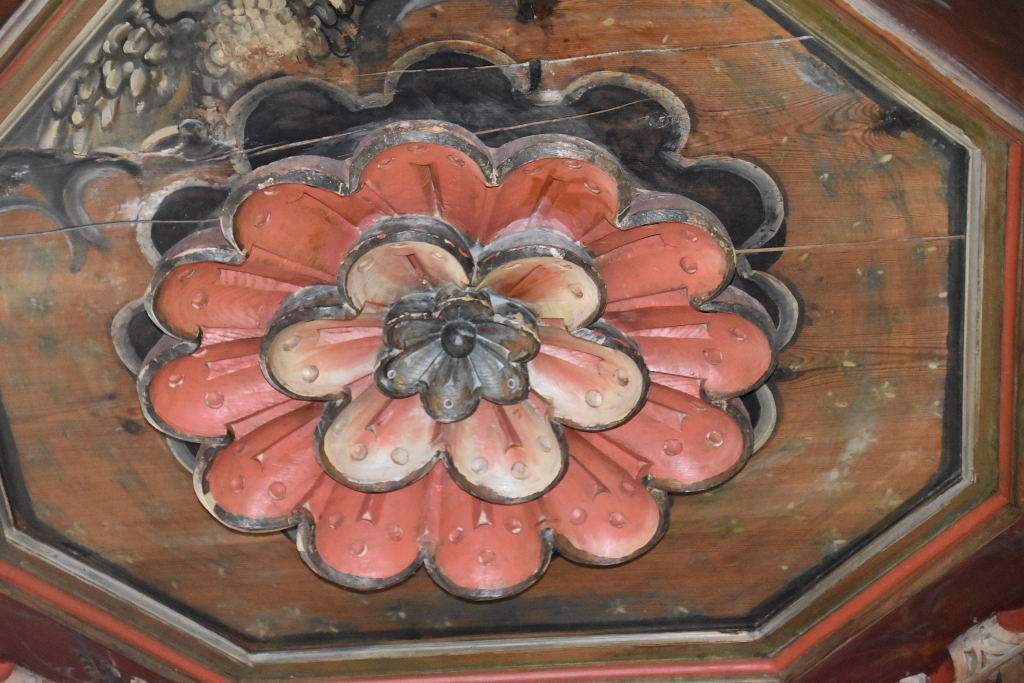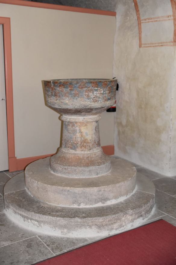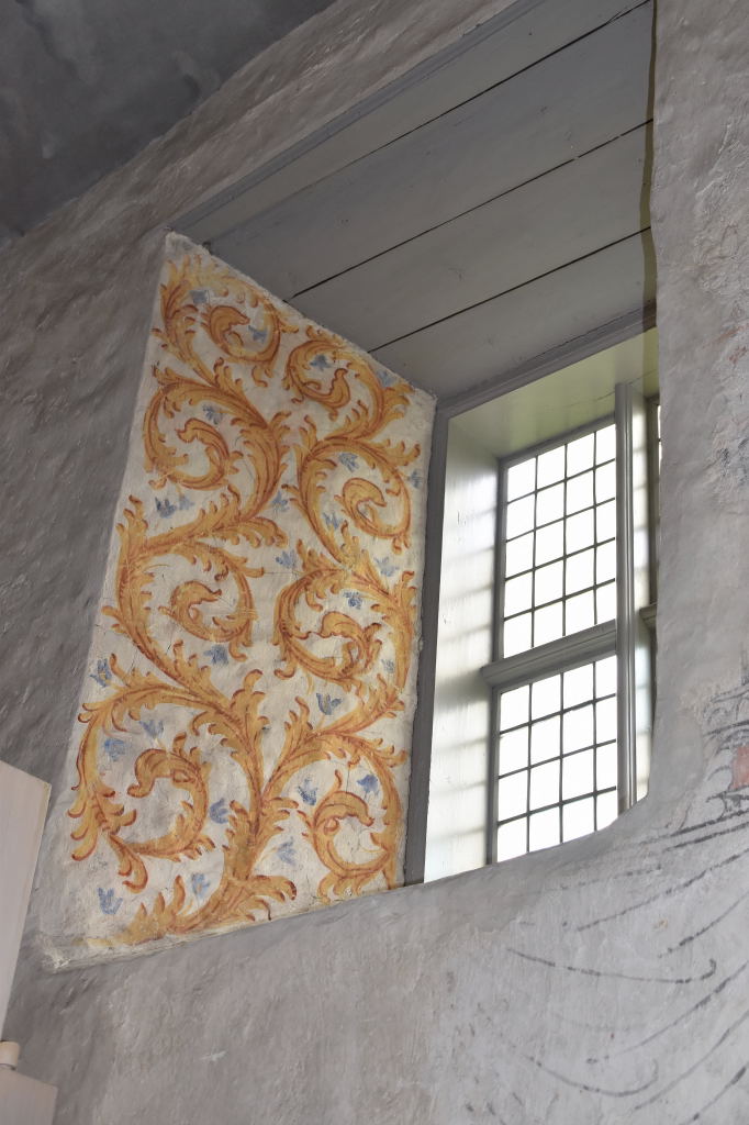 Så här ser det ut om du hade vänt dig om i kyrkan. Då kunde du njutit av den ornamentala målningen på valvbågarna och dopfunten därunder, som var en gåva av Brukspatronen Christoffer Neumans och hans hustrus dotter Margareta.