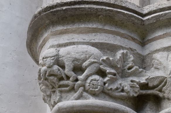 Den enkla dopfunten av röd kalksten från 1200-talet impade inte så mycket på oss. Men den fick ändå vara med på bild.