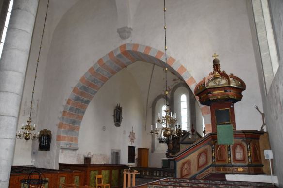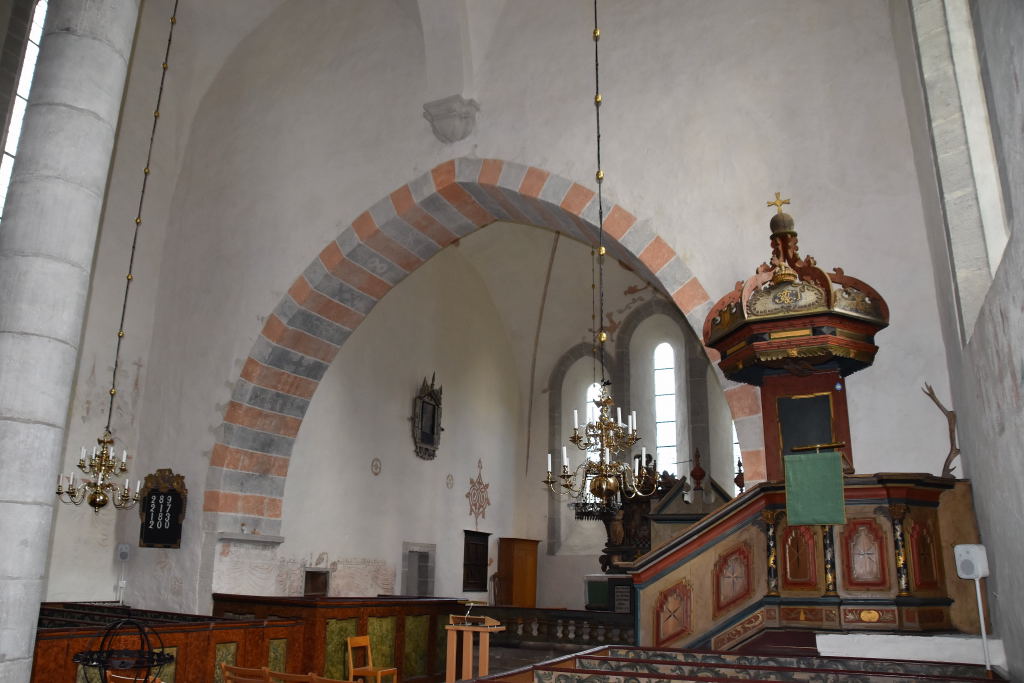 Interiör med predikstolen som är utförd av Johan Hernell 1737. Den har kvar sin ursprungliga färg.