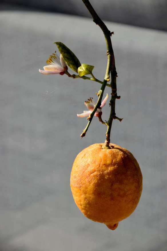 Citronträdet bär frukt och blommar på samma gång. Vackert!