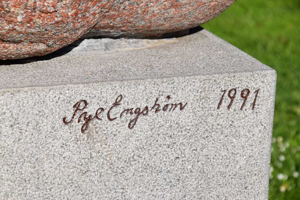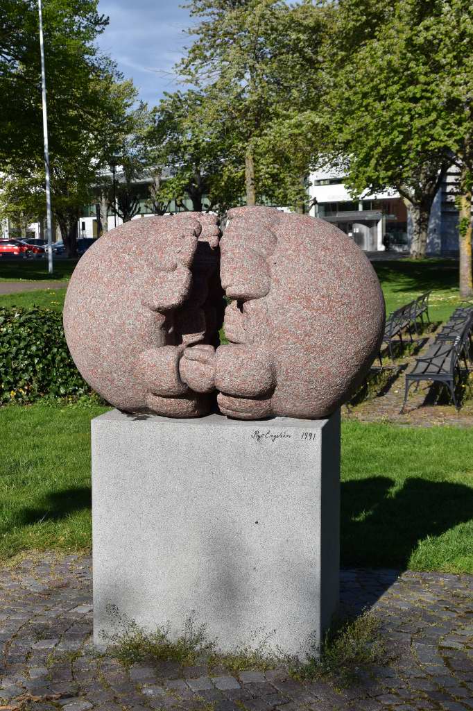 Granit är materialet. 1991 är året när ”Utsträckta händer” kom på plats i passande Almedalen. Granskar man noga ser man mellan de båda stenkloten mänskliga figurer, som trevande försöker nå varandra.