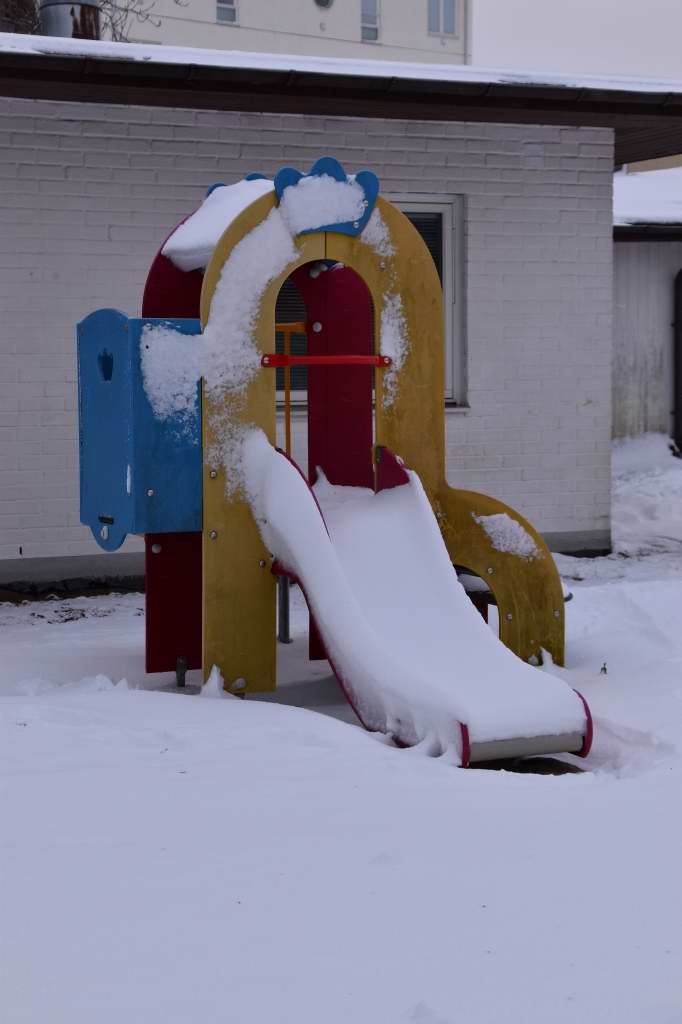 Rutschkanan längtade nog efter att helgen ska ta slut och att alla åksugna förskolebarn ska komma tillbaka igen. För egentligen finns det ju inget dåligt väder, bara dåliga kläder.