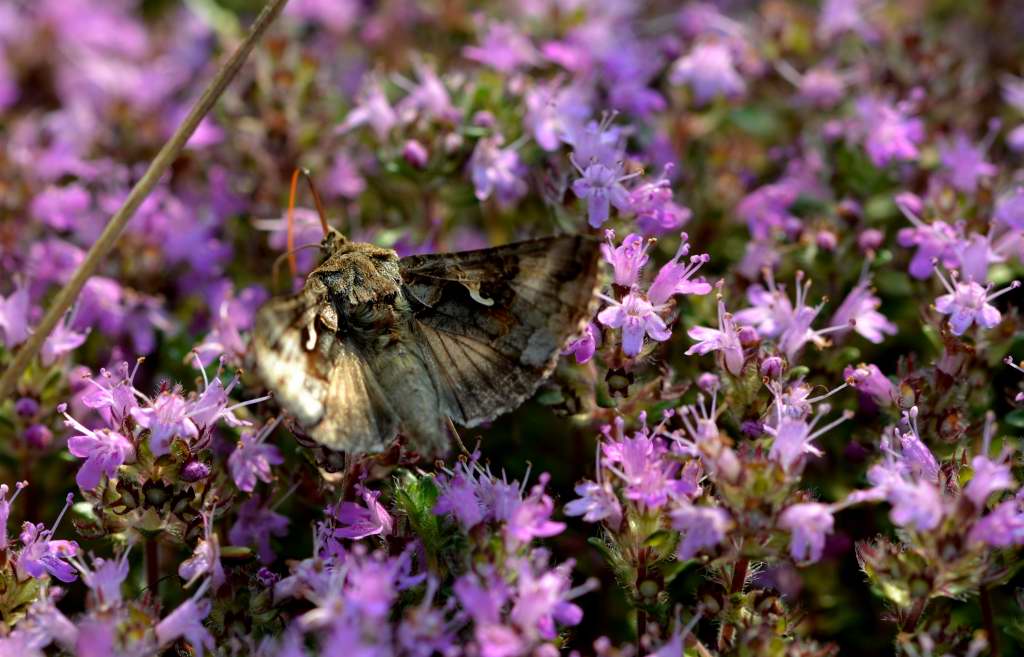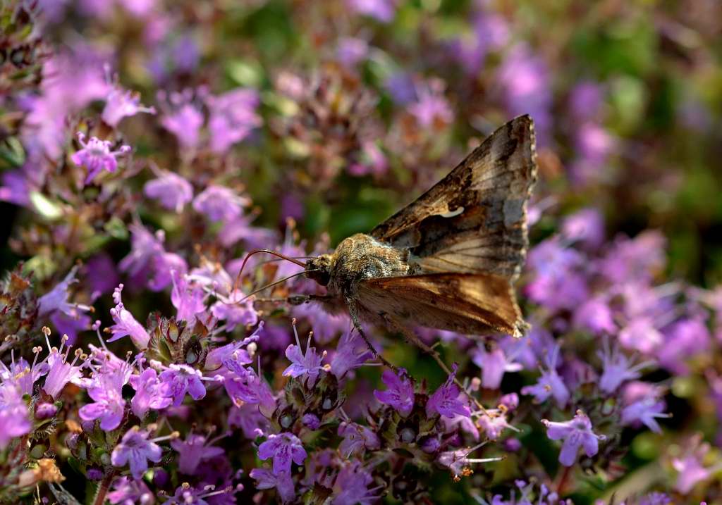 Solveig letade länge på nätet. Hon kom fram till att det borde vara en av dessa ”flyfjärilar”; Gammafly, Silverlinjerat metallfly och Brungrått metallfly. Själv gissar jag, med lite tvekan, på mittenalternativet. Vad tror du?
