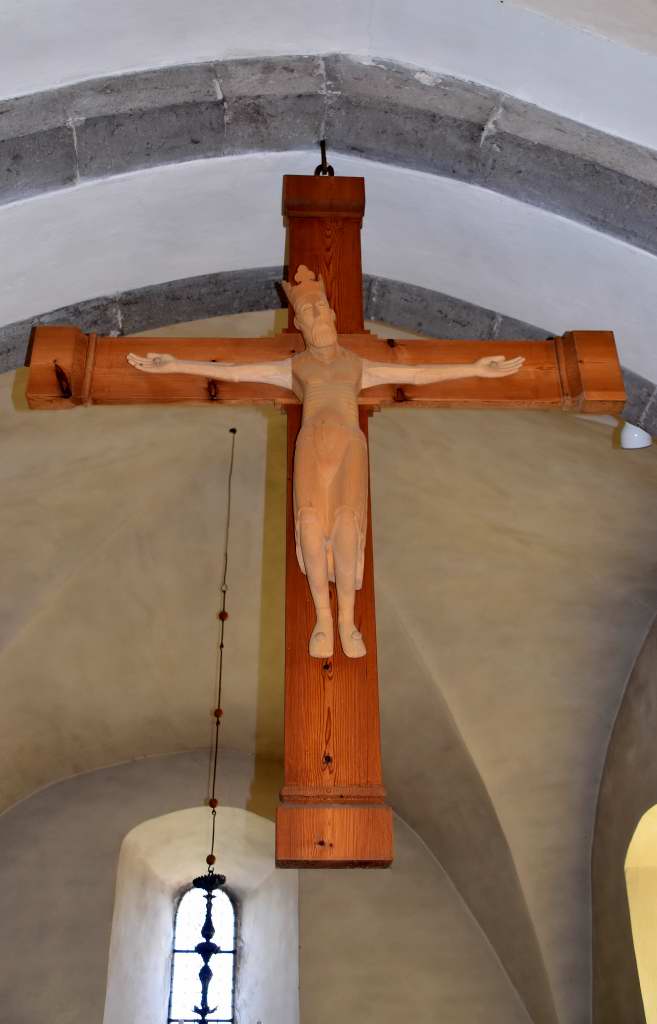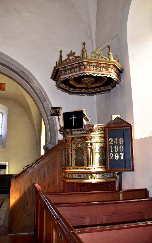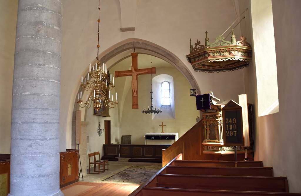 Över långhusportalen finns ett huvud. Låt oss gå in i kyrkan som många skriver påminner om grannkyrkan Hall.