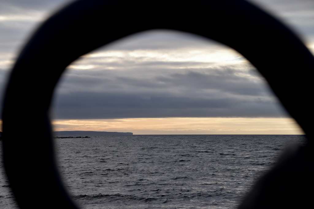 En bitut i havet syntes den lilla platta fågelön Heligholmen med sin ensamma fyr.