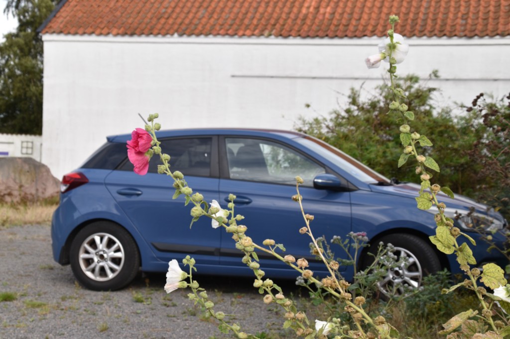 ”Den lilla blå” hade det bra tillsammans med några trevliga stockrosor.
