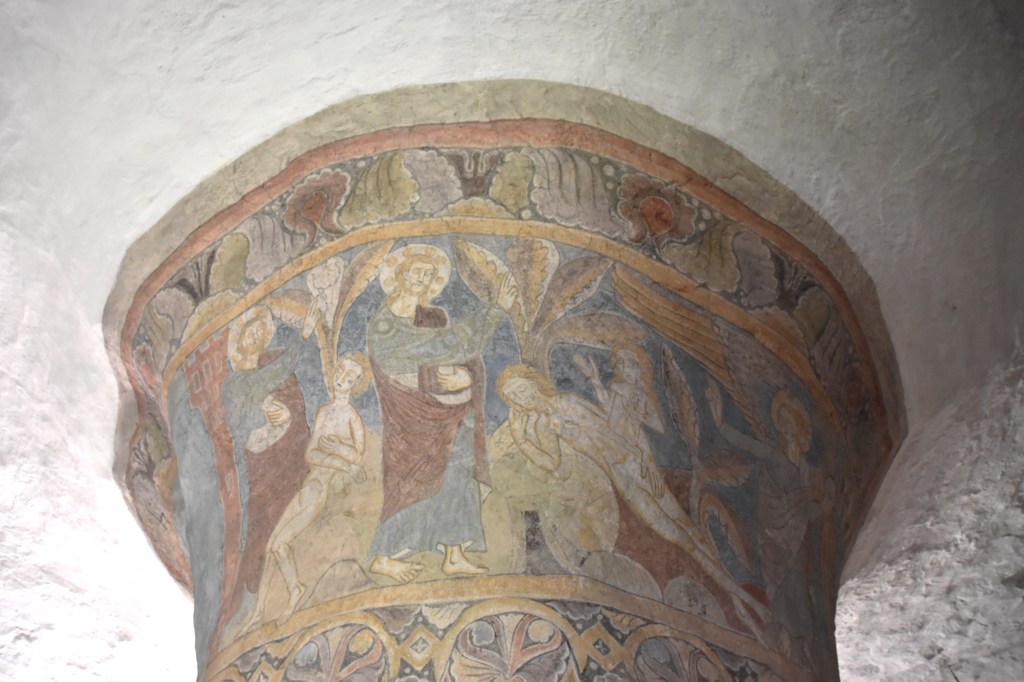 Runt den bevarade centrala pelaren finns frisen som är från 1275-1300. Den berättar i sju scener om berättelsen om korsfästelsen och syndafallet. (Tyvärr har den sista scenen gått förlorad).