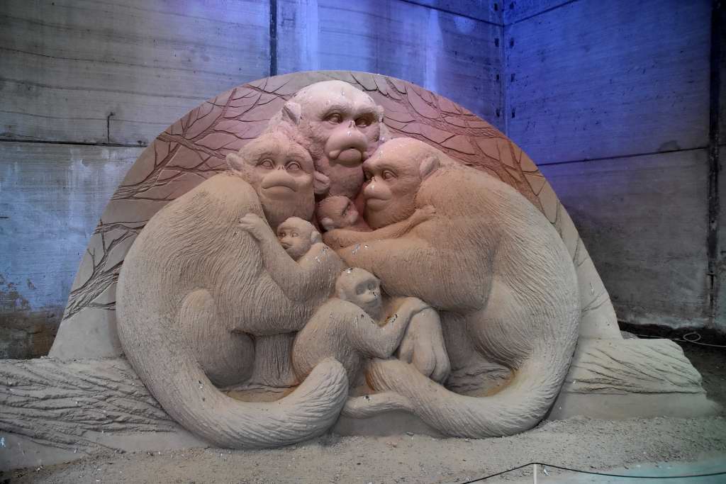 Sue Macgrew, USA, har gjort den truppnosade apfamiljen som värmer varandra. Skulpturen representerar djurvärldens förmåga att anpassa sig. Det är genom kärlek och familjeband som stammen överlever.