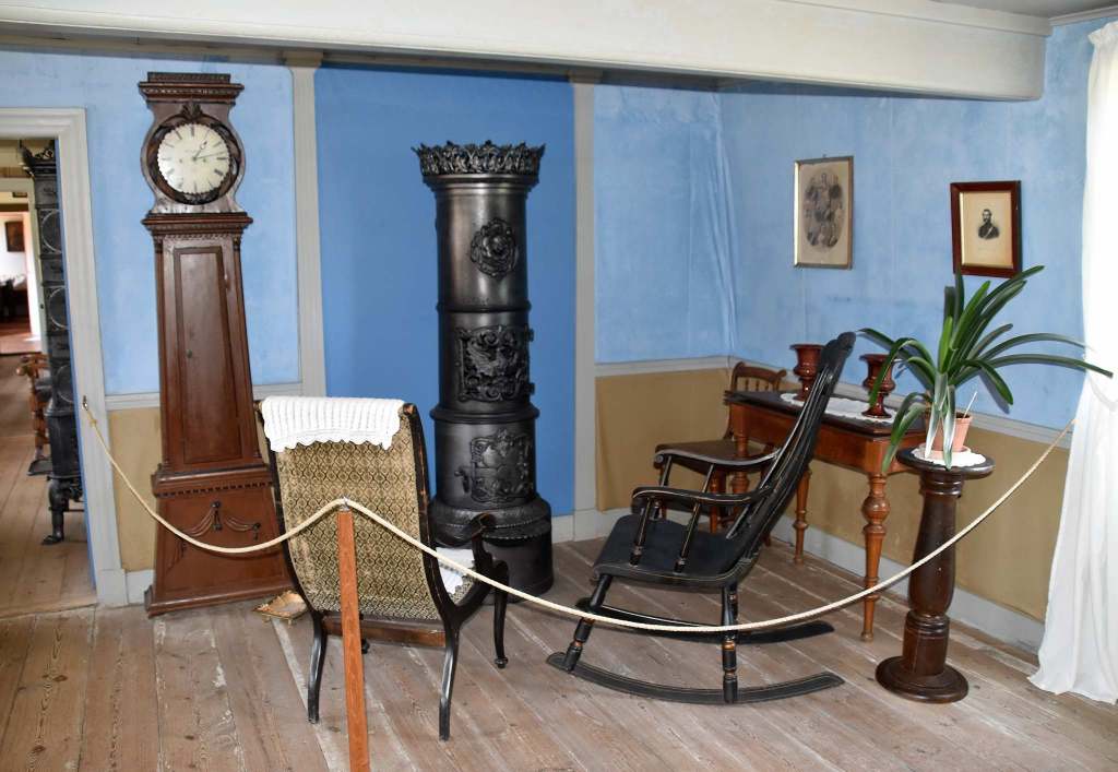 Melstedgård har ett stort boningshus med många rum. När vi sett färdigt i köket och sovrummen fortsatte vi till finrummet. En mysig hörna med kakelugn. Den såg inbjudande ut.