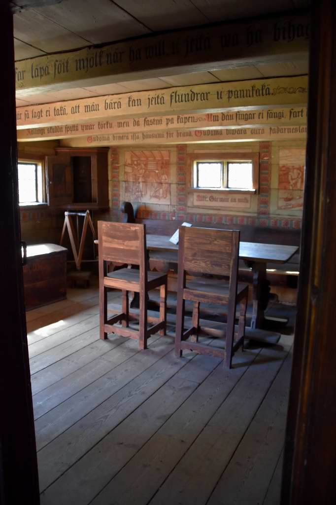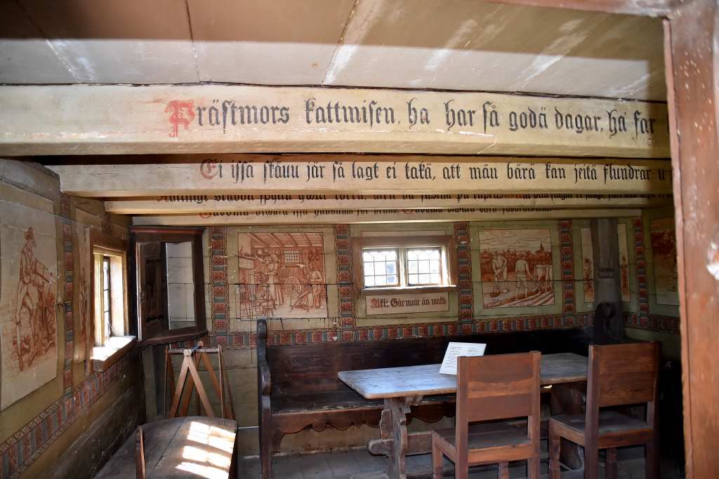 Intressant att få en dos av gutamål på takbjälkarna. På ”stödet” på träbordet kunde jag läsa översättningen till ren rikssvenska. Roligt att jämföra, efter att först försökt lösa det själv.