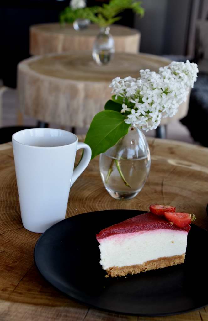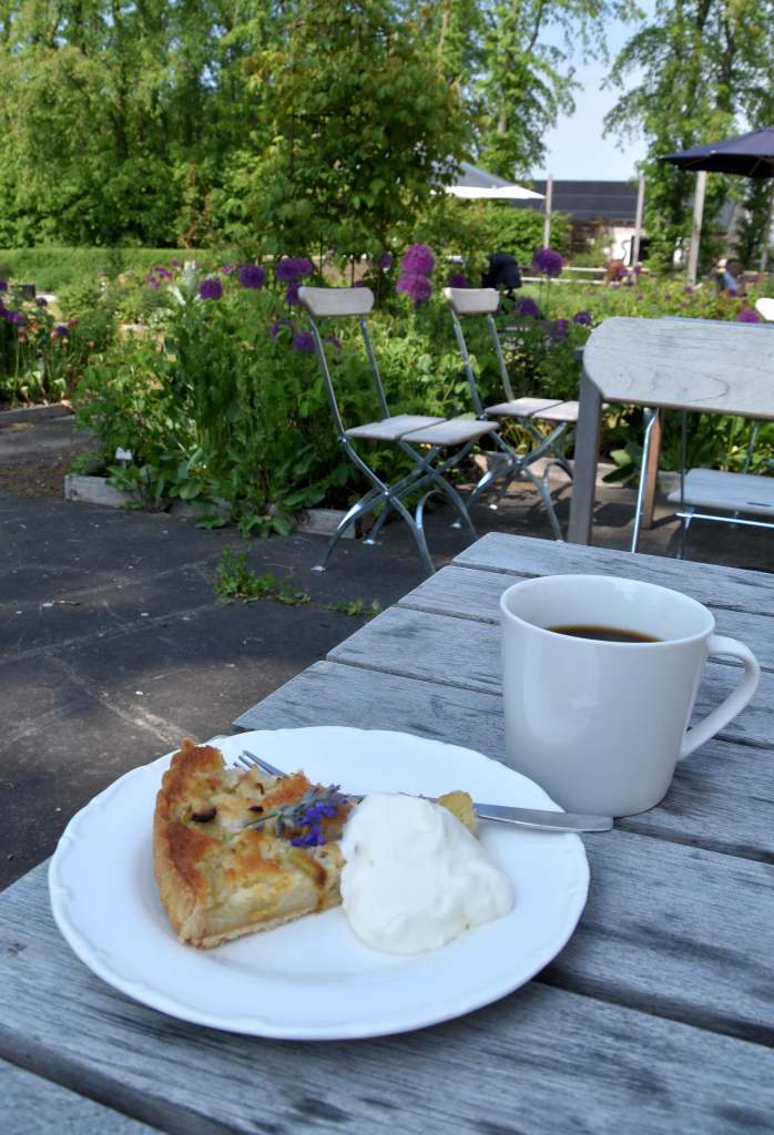 Jag uppskattar konceptet med att få välja sin egen kaffekoppsmodell. Kanske har det något att göra med vår tid med Lidéns Samlingsmuseum, när vi visade upp 3 333 st olika kaffekoppar. Solveig väljer alltid en tunn kopp. Till kaffet i den valde hon röd vinbärspaj. Eftersom det var skönt väder valde vi bord i trädgården.