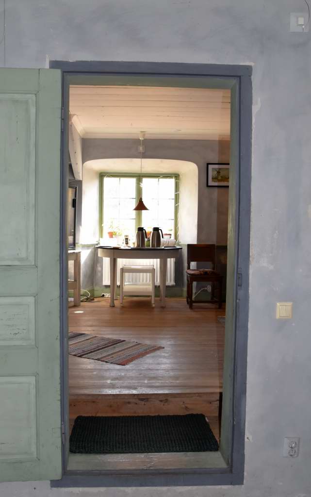 Utanför vårt fönster såg vi bäcken från klinten som rinner precis vid huset. Med tanke på allt vatten så nära var det omöjligt att bygga en källare under huset.