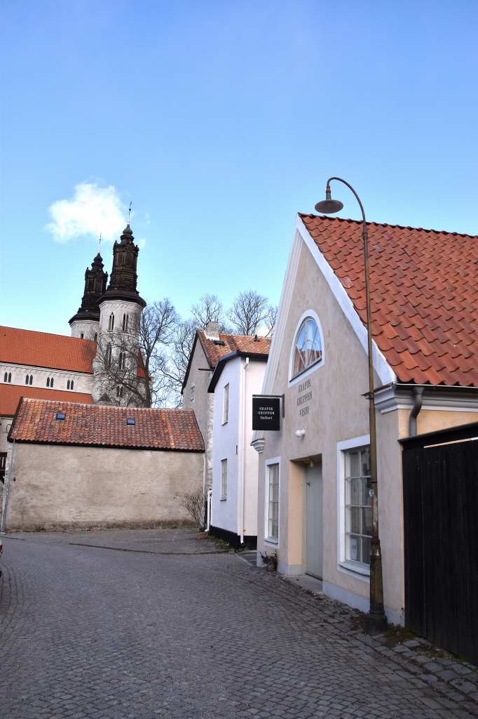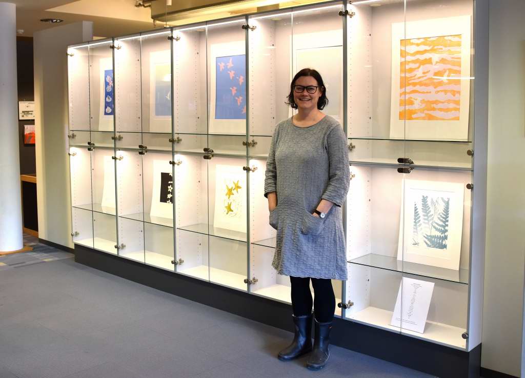En våning upp i biblioteket träffade jag en annan av mina kollegor, Annika Olsson. Hon är en av medlemmarna i Grafikgruppen Visby, en kollektiv verkstad. Just nu finns en utställning av hennes grafiska konst, ”himlen har alla färger”, fint arrangerad i bibliotekets glasmontrar. Utställningen kommer att finnas kvar under hela april.