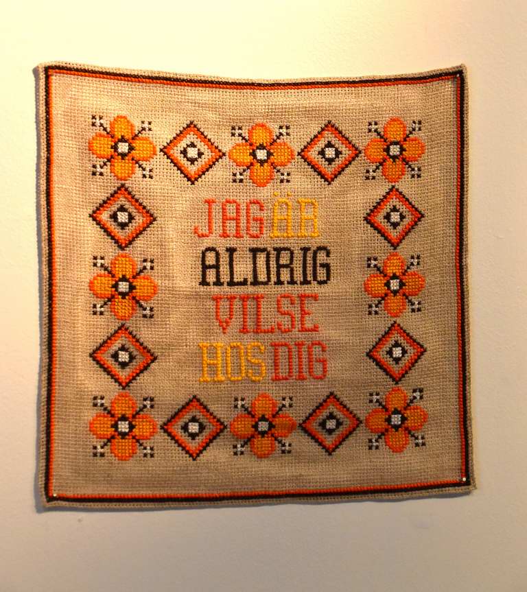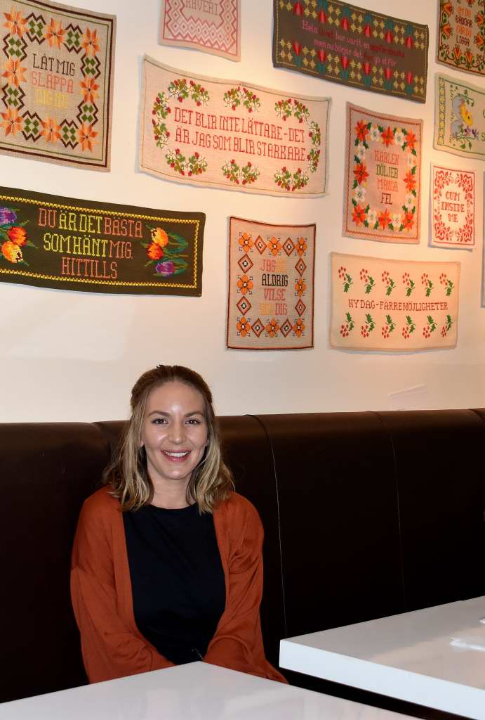Där träffade jag min kollega Mathilda Persson som gillar att sy korsstygn. Förrförra sommaren blev hennes jobb som guide inställt p.g.a. pandemin och eftersom hon inte hade ”något att göra” på sommarlovet började hon brodera. Ett broderi blev två och tre… och så bara fortsatte det. Idag uppskattar hon att hon sytt ungefär 150 olika texter på bonader och dukar. Tänk som det kan bli! ”Billies broderi” är hennes pseudonym, döpt efter hennes katt Billie. Idag invigdes hennes utställning i saluhallen. Den pågår fram till den 8/5-22