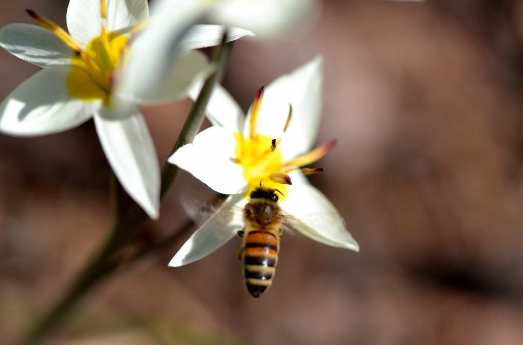 Alla bin jobbade febrilt. De flesta surrade omkring en alltför kort stund för att jag skulle hinna ställa in skärpan och ta kort. Det här biet fastnade till sist.
