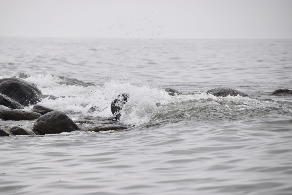 Vi tog med oss själva och fikakorgen till den lite instabila bryggan och slog oss ner längst ut. Vädret var på gränsen mellan skönt gråväder och kyliga vindar från havet. En äldre man klev ut på bryggan och därefter ner i det blöta och steniga. (Jag såg bara stenar och grönt sliskigt halt på dem) Jag var rädd för att han skulle halka och tappa balansen på havsbotten när en lurig våg svepte in.