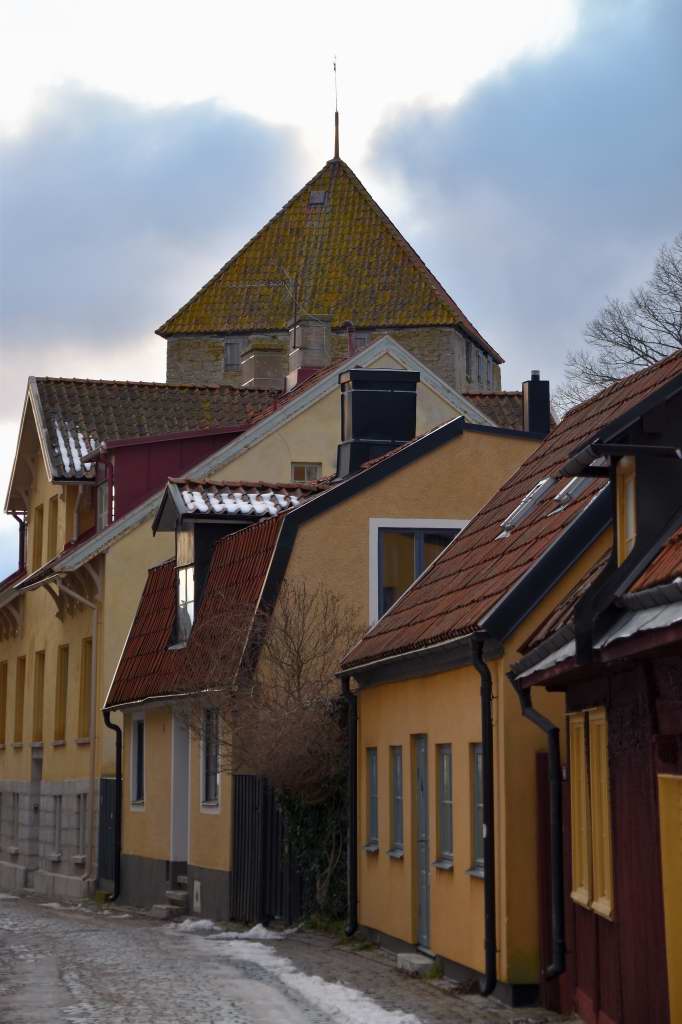 Den pampiga stora kyrkan Gothem visade vi upp för ett tag sedan. Den här gången blir det ett kort inlägg om kastalen framför den. Den lilla borgen är skamfilad av ålder från detta håll. Det lär tvistas om exakt byggdatum. Sant är att försvarstornet är minst från 1100-talet.