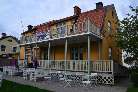 Möjligheternas sittplatscafé skulle jag kunna kalla detta ställe, som även serverar frukost och luncher. Är det fint väder går det att sitta på många ställen utomhus. Se första bilden med två våningar + trädgården. Störningsmomentet är stora skräniga kajor. En annan gång satt jag ensam där i trädgården. Då gick tre asiatiska kvinnor ut med sin frukost och placerade den på ett bord. Sedan gick ALLA in igen för att hämta mer ätbart. Det tog inte många sekunder förrän första kajan flog till det dukade bordet och några sekunder senare fick sällskap av tjocka släkten. Jag fick fullt upp med mitt nya jobb. ”Viftande hojtande polis”. 🙂