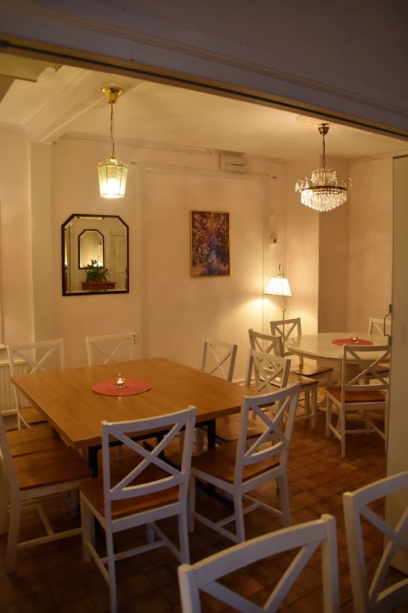 Vid bordet längst in i hörnet satt vi den där första gången. Då var det fullt med folk vid de andra borden. Det var spännande att lyssna på dialekter och olika språk.