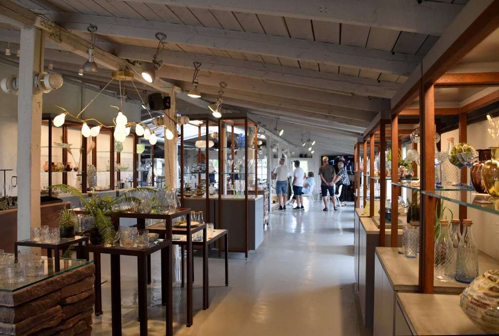 Längst in i den ljusa och fräscha lokalen finns glasbrukets öppna verkstad. Det är bara att slå sig ner på en stol och ta del av hur en klump rykande, varm glasmassa förvandlas till en vacker vas, ett unikt glas, en fin kanna eller något annat.