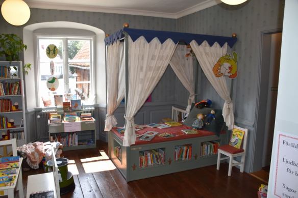 Solveig som jobbat som barnbibliotekarie trivdes antagligen extra mycket i detta rum. Men även jag hade kunnat slappa i sängen med en bra bok. När jag blev ensam tog jag ner en bok som måste hamnat fel. Den hette ”Mina fotsteg i ditt hjärta”. Jag somnade efter 18 sidor. 😉