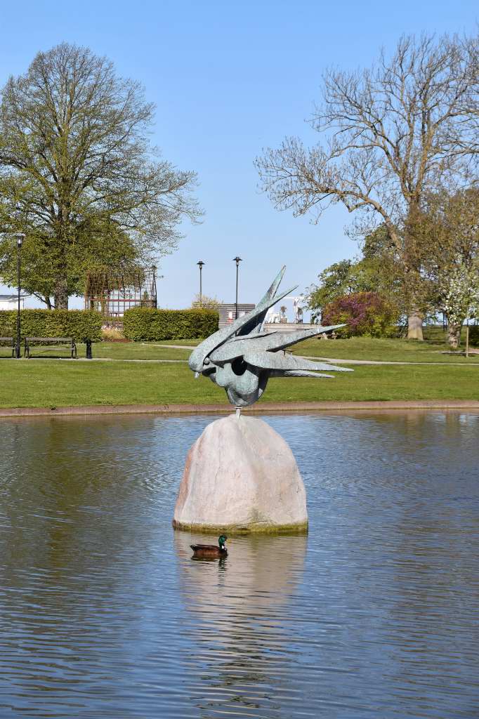 Givetvis är det en perfekt plats, att placera ett konstverk i dammen. Mitt bland alla andra levande fåglar. I blickfånget från parksugna, förbipasserande och oräknade turister.