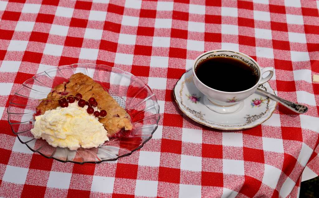 Jag uppskattar konceptet med att få välja sin egen kaffekoppsmodell. Kanske har det något att göra med vår tid med Lidéns Samlingsmuseum, när vi visade upp 3 333 st olika kaffekoppar. Solveig väljer alltid en tunn kopp. Till kaffet i den valde hon röd vinbärspaj. Eftersom det var skönt väder valde vi bord i trädgården.