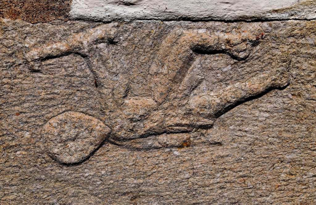 Denna intressanta relief av en liggande man med hammare i ett av stenblocken i korportalen har två olika berättelser bakom sig.
