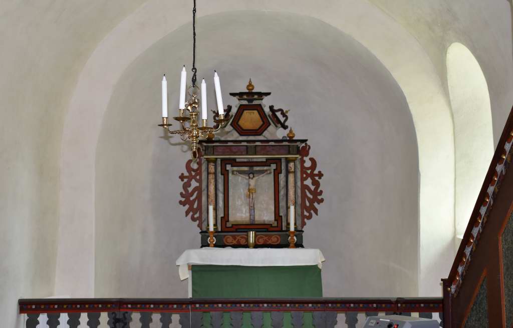 Altaruppsatsen är ett arbete från 1600-talets slut, i mittfältet finns ett krucifix av trä från 1400-talet.