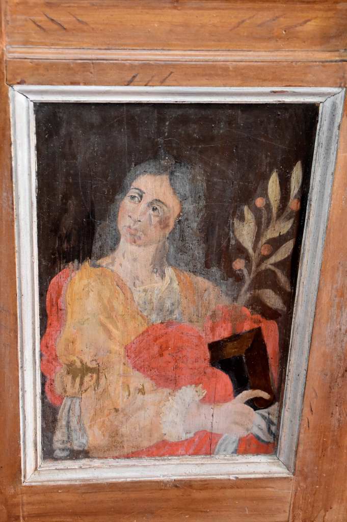 Bänkinredningen är från 1600-talet. Dörrarna har målade porträtt av figurer i tidstypiska karolinska högreståndsdräkter.