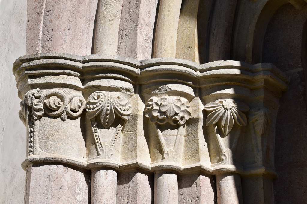 Det finns både djur, människor och växtreliefer på kapitälen.