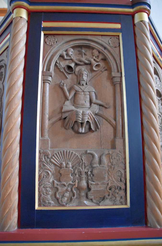 De två tavlorna på sista bilden är ditsatta 1980, när altarutsmyckningen blev utbytt. Konstnären heter Paul Höm och har även målat altartavlan i rundkyrkan Österlars.