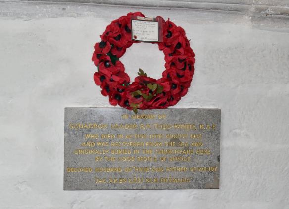 På andra sidan finns en annan stentavla som är ett minne om en engelsk flygare, RAF, som störtade i Östersjön under andra världskriget. Hans döda kropp spolades i land på stranden i Sproge.