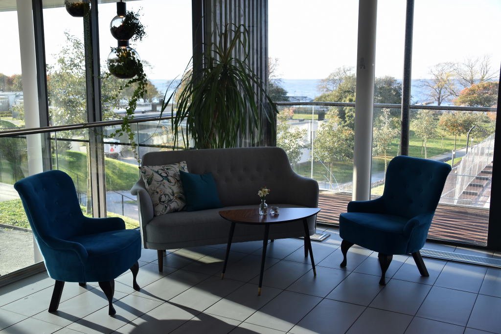 Skönt med sittplatser med utsikt. Samtidigt kan det bli ”sittsår” om man sitter där för länge. Tänker på stunden när det aldrig kom någon och låste upp dörren till frukosten klockan sju. Vi såg mannen långt därinne, som ställde fram saker på borden och tände ljus.