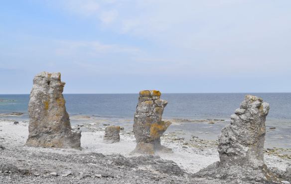 Men vågorna vann inte fighten mot den betydligt hårdare revkalkstenen, en sten som redan från början var hopkittad. Därför finns det fortfarande i våra dagar kvar höga pelare med revkalksten – raukar.