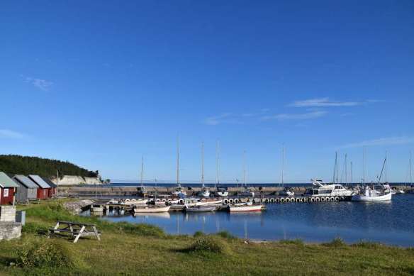 Med Corona-respekt gick jag inte mellan raukarna. Ville heller inte störa deras tidiga morgonpratstund. Istället tog vi sikte mot fiskeläget – efter att en sista gång njutit av havsutsikten. Vilket vackert raukfält. ❤