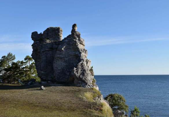 Vårt mål var att komma nära Gotlands högsta rauk, Jungfrun. Dess topp når 12 meter över den platå den står på och 26 meter över havet. Imponerande.