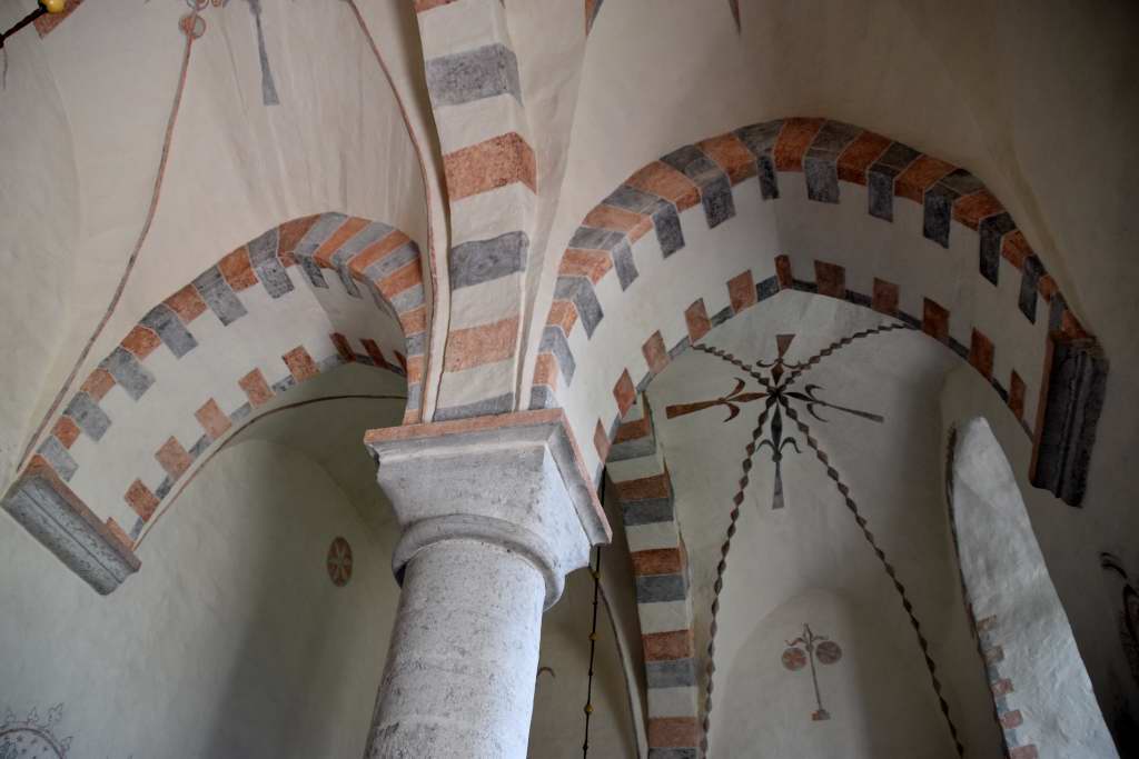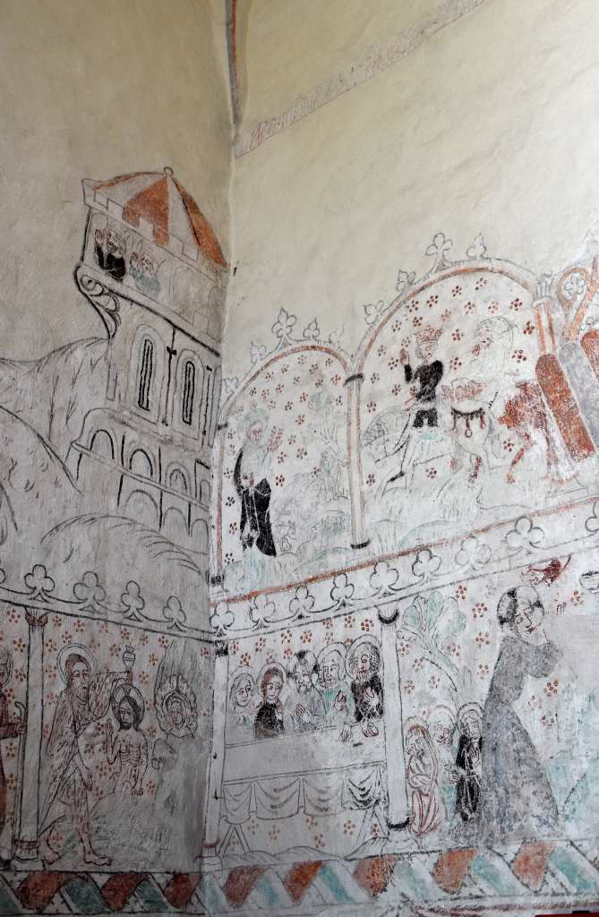 Målningarna är från två tidsperioder. De från 1200-talet är signerade Halvard. Målningssviten med 160 figurer utfördes på 1400-talet av Passionsmästarens verkstad. I sviten visas scener från Kristus barndomshistoria och Kristi lidandes historia. Legenden om Sankta Margareta som vägrade tillbe en avgudabild och utsattes för bestraffningar och till sist halshöggs finns också med.
