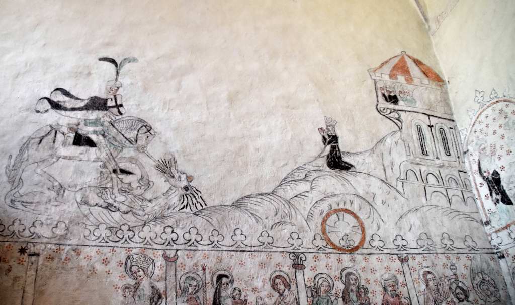 Vid 1400-talets mitt tillkom denna medeltida kalkmålning, föreställande S:t Mikael som drakdödare.