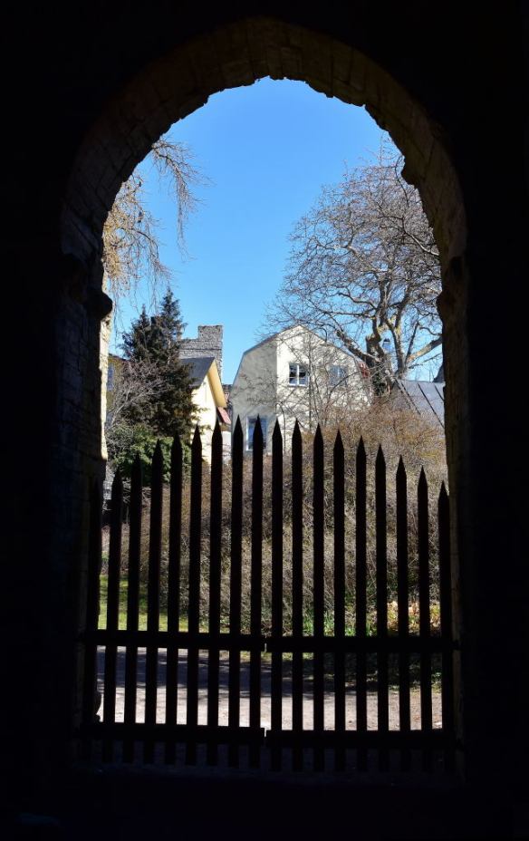 Jag skulle gärna vilja ha nycklarna till grindarna. På sista inlagda bilden sträcktes kameran så långt fram som jag vågade. Därmed blev det en ”glimt” av det inre taket.