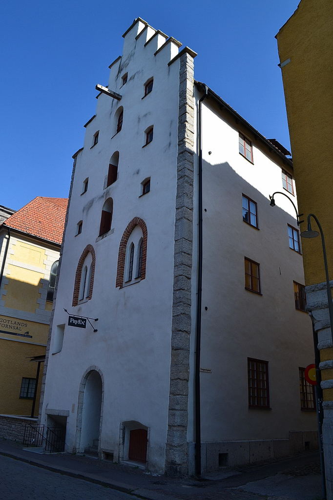 Här får du en ”Husets historia”: Det finns en välvd högkällare i två plan. Över den finns en våning med tegelomfattade spetsbågiga fönster. Denna bostadsvåning kan ha varit en sommarbostad och festvåning. Däröver finns tre magasinsvåningar med lastportar placerade på rad under en hissbom.